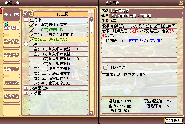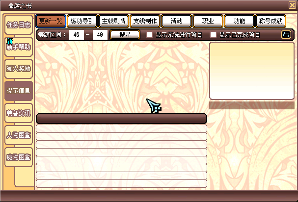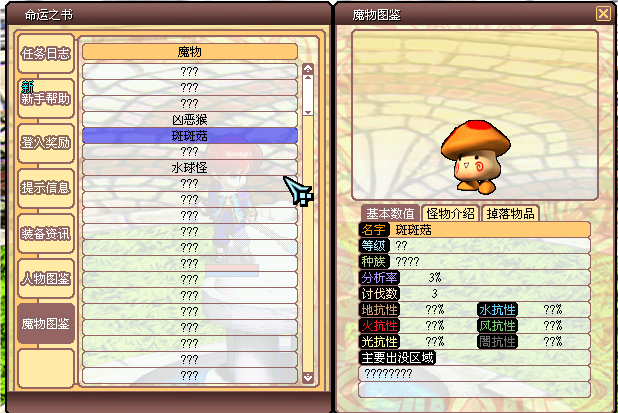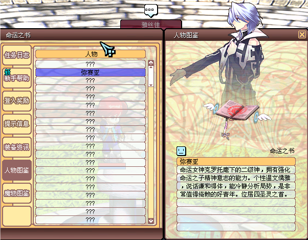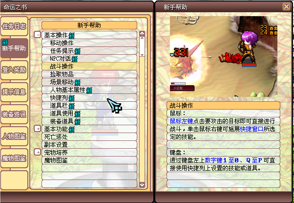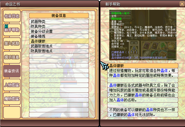 游戏引导工具,包含『任务日志』、『新手帮助』、『登入奖励』、『提示信息』、『装备资讯』、『人物图鉴』、『魔物图鉴』等七项功能。