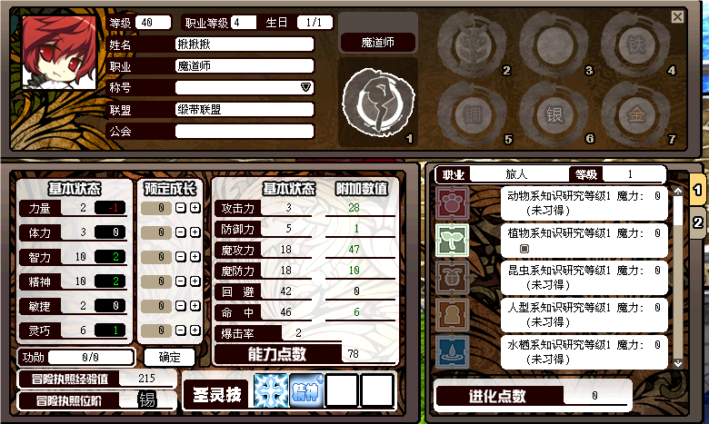 快速键『F2』确认玩家当前角色的基本资料、目前职业徽章、战斗能力资讯、拥有的职业技能资讯、目前的执照点数与执照等级,此外玩家角色的六项基本能力和职业点数配置都在这里进行。