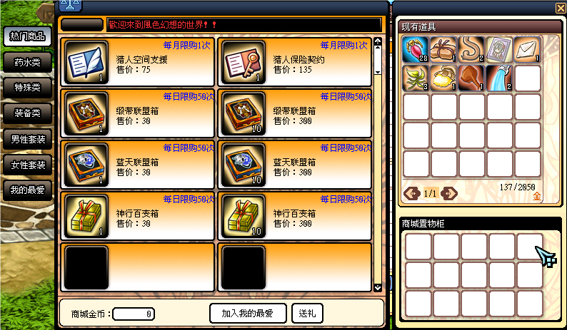 开启商城视窗,可在商城内购买【热门商品】、【药水】、【特殊商品】、【装备】、【男女套装】等多项商城商品,另外也可将喜爱的商品加入【我的最爱】方便下次购买。